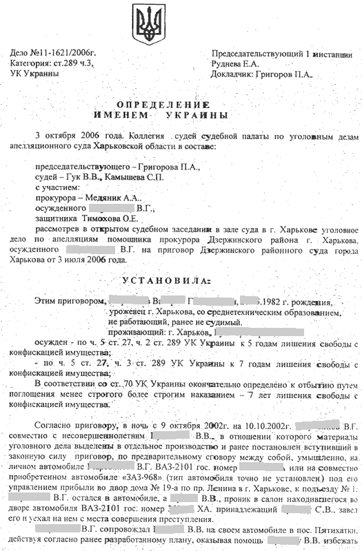 24-летний В.Г. приговором суда от 03.10.2006 года был признан виновным по ч.2 ст.289 УК Украины за его якобы причастность к двум угонам транспортных средств и ему было назначено наказание в виде семи лет лишения свободы с конфискацией имущества.