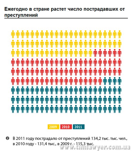Ежегодно в стране растет число пострадавших. В 2011 году пострадало от преступлений 134,2 тыс. тыс. чел., в 2010 году - 131,4 тыс., в 2009 г. - 115,3 тыс.).